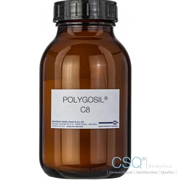 Irregular silica phase for liquid chromatography (LC, HPLC), modified silica gel (C8) for reversed phase applications.