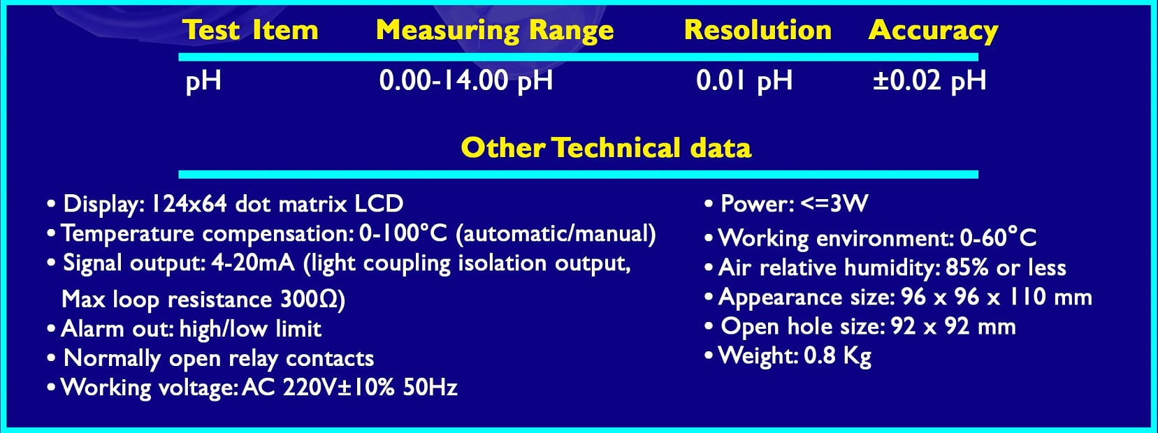 – With pH high limit & low limit alarm, double relay control, hysteresis can be adjusted freely