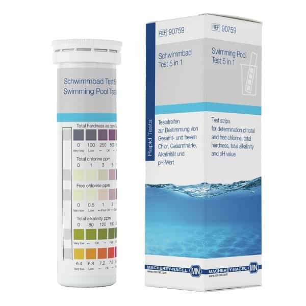 | Gradation | Alkalinity – 0 • 80 • 120 • 180 • 240 mg/L CaCO₃, Free chlorine – 0 • 0.5 • 1 • 3 • 5 • 10 mg/L Cl₂, pH – 6.4 • 6.8 • 7.5 • 7.6 • 8.4, Total chlorine – 0 • 1 • 3 • 5 • 10 mg/l Cl₂, Total hardness – 0 • 100 • 250 • 500 • 1000 mg/l CaCO₃ |
