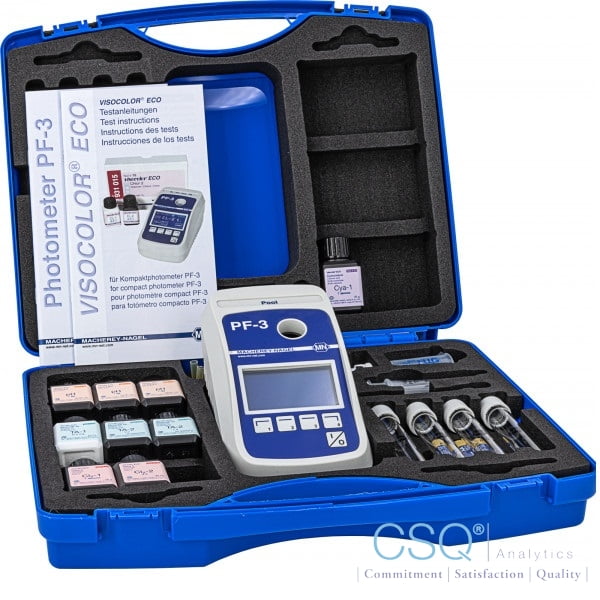 | Scope of delivery | Case, PF-3 Pool, test kits, calibration cuvette, 4 empty tubes, beaker, 5 mL syringe, 3 batteries, manual, instruction and certificate |
